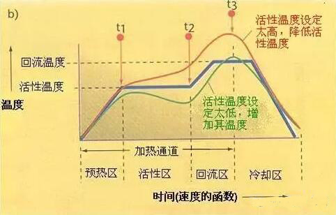 活性區(qū),有時叫做干燥或浸濕區(qū),這個區(qū)一般占加熱通道的33~50%,有兩個功用,第一是,將PCB在相當穩(wěn)定的溫度下感溫,允許不同質(zhì)量的元件在溫度上同質(zhì),減少它們的相當溫差。第二個功能是,允許助焊劑活性化,揮發(fā)性的物質(zhì)從錫膏中揮發(fā)。一般普遍的活性溫度范圍是120~150°C。